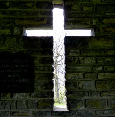 Tag: croce, albero, muro, mattoni, lapide, fessura, targa, caduti, finestra, pianta.