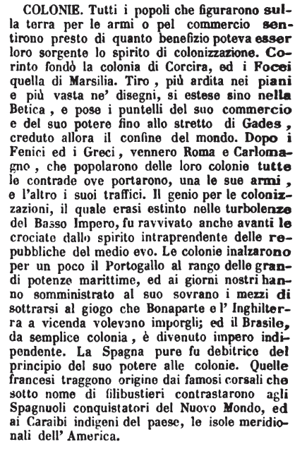 | Colonie - Tutti i popoli che figurarono sulla terra per le armi o pel commercio sentirono presto di quanto benefizio poteva esser loro sorgente lo spirito di colonizzazione. Corinto fondò la colonia di Corcira, ed i Focei quella di Marsilia. Tiro, più ardita nei piani e più vasta ne' disegni, si estese sino nella Betica, e pose i puntelli del suo commercio e del suo potere fino allo stretto di Gades, creduto allora il confine del mondo. Dopo i Fenici ed i Greci, vennero Roma e Carlomagno, che popolarono delle loro colonie tutte le contrade ove portarono, una le sue armi, e l'altro i suoi traffici. Il genio per le colonizzazioni, il quale erasi estinto nelle turbolenze del Basso Impero, fu ravvivato anche avanti le crociate dallo spirito intraprendente delle repubbliche del medio evo. Le colonie inalzarono per un poco il Portogallo al rango delle grandi potenze marittime, ed ai giorni nostri hanno somministrato al suo sovrano i mezzi di sottrarsi al giogo che Bonaparte e l'Inghilterra a vicenda volevano imporgli; ed il Brasile, da semplice colonia, è divenuto impero indipendente. La Spagna pure fu debitrice del principio del suo potere alle colonie. Quelle francesi traggono origine dai famosi corsali che sotto nome di filibustieri contrastarono agli Spagnuoli conquistatori del Nuovo Mondo, ed ai Caraibi indigeni del paese, le isole meridionali dell'America. [immagine] |