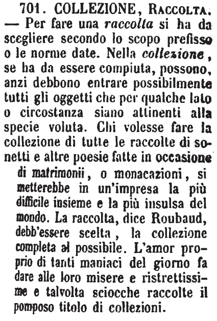 Collezione, Raccolta - Per fare una raccolta si ha da scegliere secondo lo scopo prefisso o le norme date. Nella collezione, se ha da essere compiuta, possono, anzi debbono entrare possibilmente tutti gli oggetti che per qualche lato o circostanza siano attinenti alla specie voluta. Chi volesse fare la collezione di tutte le raccolte di sonetti e altre poesie fatte in occasione di matrimonii, o monacazioni, si metterebbe in un'impresa la più difficile insieme e la più insulsa del mondo. La raccolta, dice Roubaud, debb'essere scelta, la collezione completa al possibile. L'amor proprio di tanti maniaci del giorno fa dare alle loro misere e ristrettissime e talvolta sciocche raccolte il pomposo titolo di collezioni. [immagine]